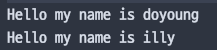 결과가 각각 doyoung 과 illy 가 찍혔는데, 이 문자들은 호출 하기 전에 선언하였고 호출 할 때, 변수를 소괄호 안에 넣어서 호출 했다.